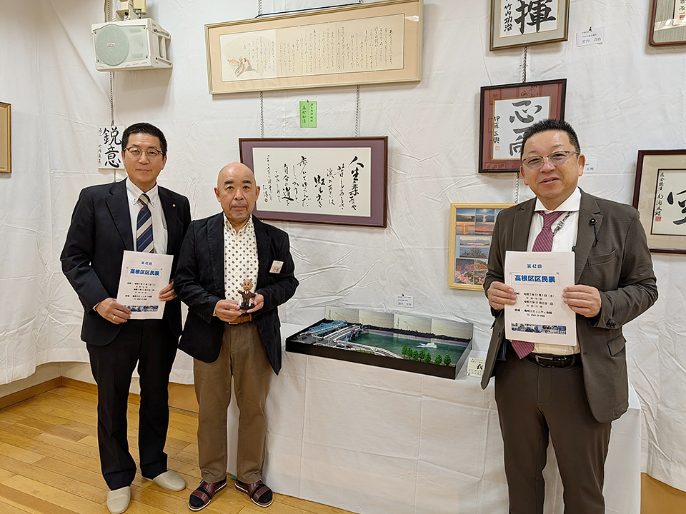 亀崎高根区区民展、館長と鈴木市議と一緒にパチリ!